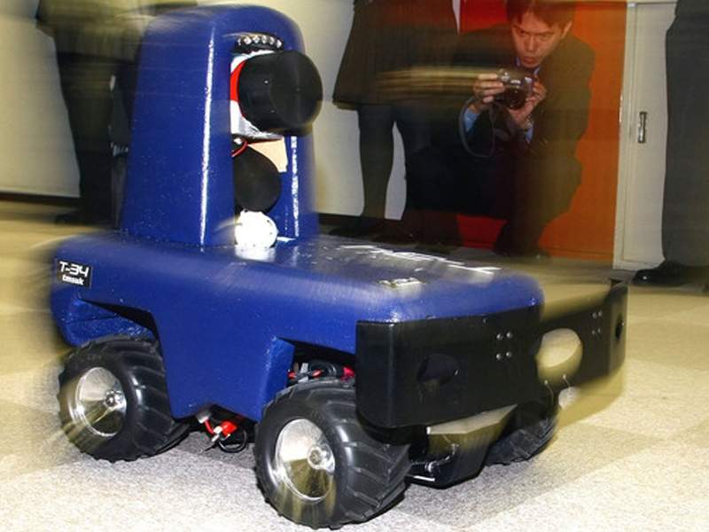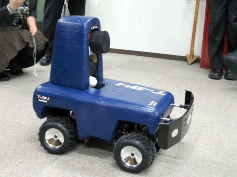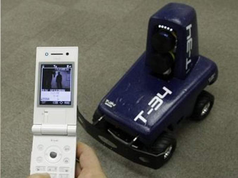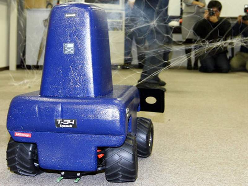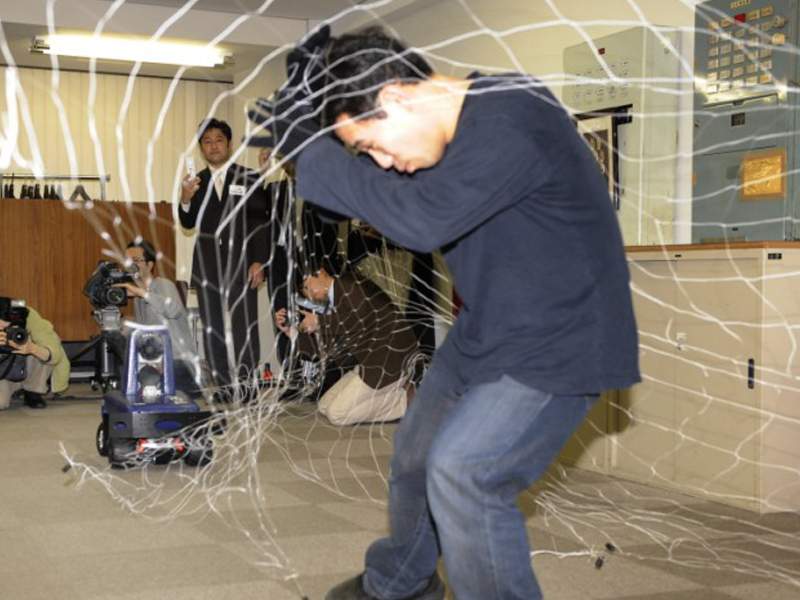 The robot, which has sensors that react to body heat and sound, can launch a net against an intruder by remote-control during its surveillance.