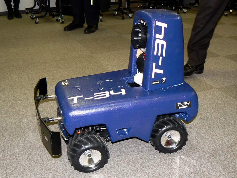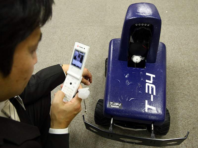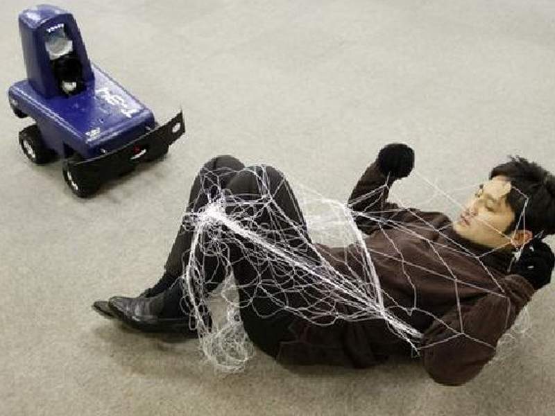 Tmsuk T-34 Security RobotA mock intruder, tangled in a net that was launched by the remote-controlled security robot T-34, lies on the floor while posing beside the robot in Tokyo January 21, 2009. T-34 users can see live images from the robot's camera and control the robot using a mobile phone.